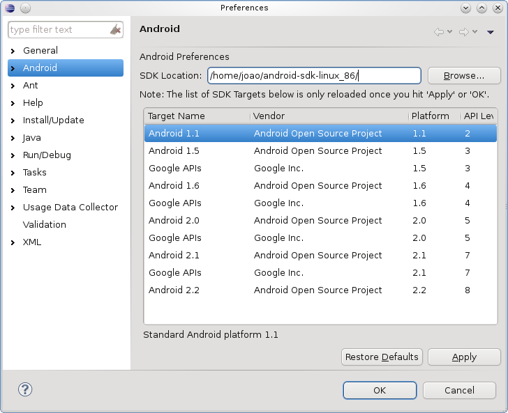 Após abrir o Eclipse clique em Window > Preferences e em SDK Location adicione a localização do SDK.