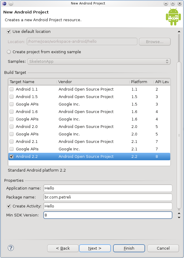 Agora em Project name coloque o nome do projeto e em Build Target selecione qual Android será utilizado.
